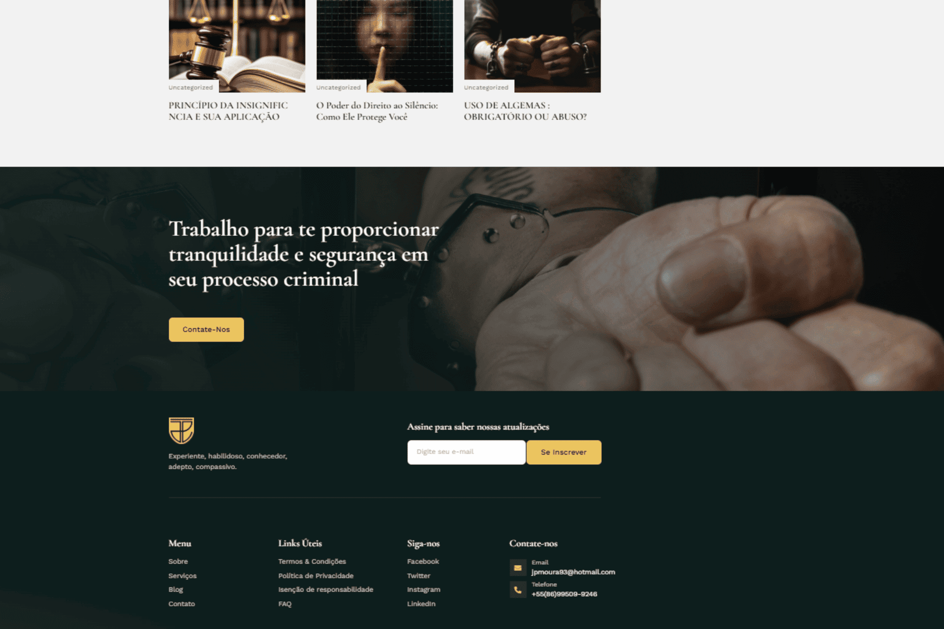 Ao construir o site do Dr. Juan Pablo, meu objetivo principal foi criar uma plataforma que transmitisse profissionalismo, confiança e autoridade, refletindo a expertise dele como advogado criminalista. Para isso, segui um processo cuidadoso e estratégico, desde o planejamento até a entrega final. Confira o site: https://juanadvcriminal.com.br/
